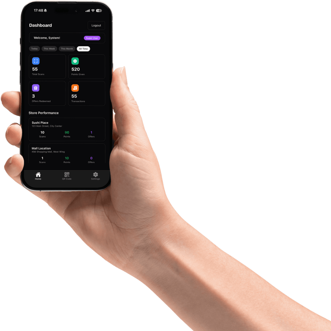 FidelPOS puts your entire loyalty programme in your staff's hands. Scan QR codes, assign points, and redeem rewards in seconds — with every transaction synced live to your Operalytics Central dashboard.
